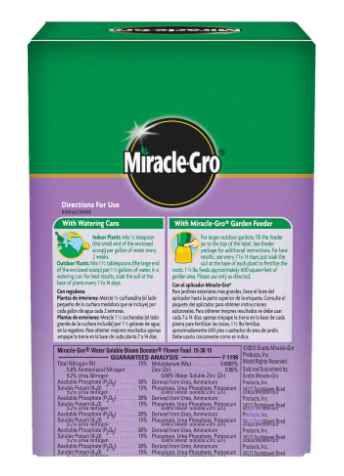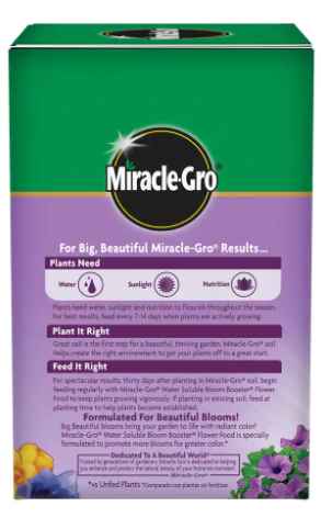 Miracle-Gro® Water Soluble Bloom Booster® Flower Food promotes more blooms for greater color compared to unfed plants. Use our flower food with the Miracle-Gro® Garden Feeder or any watering can, and feed every 2 weeks. Get beautiful results with Miracle-Gro®.