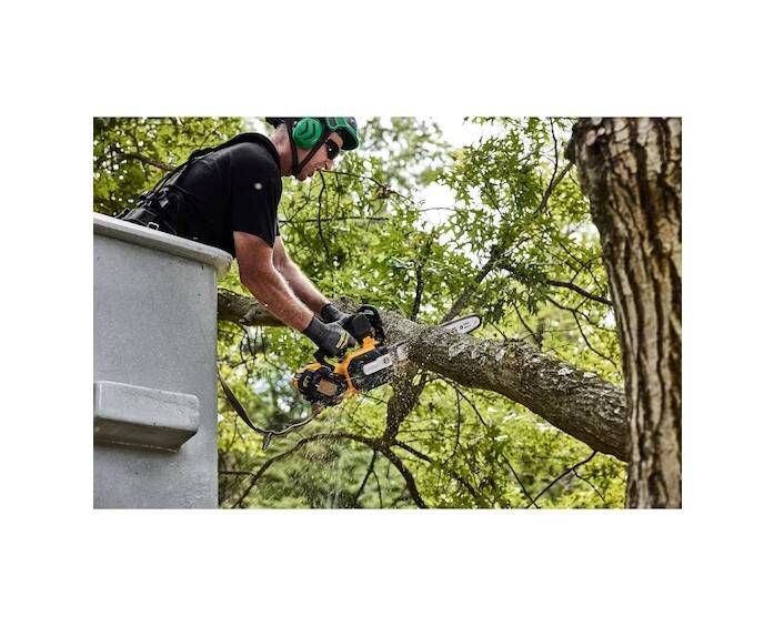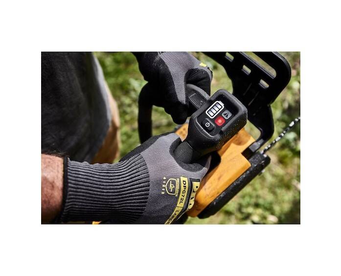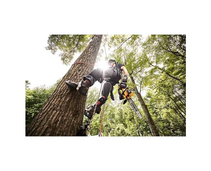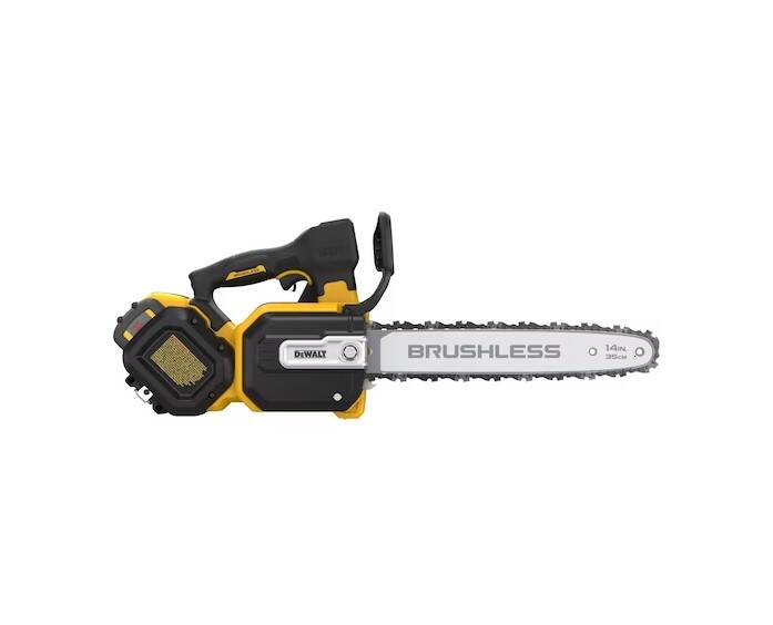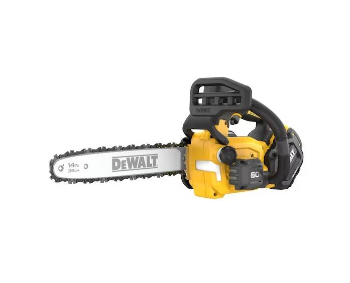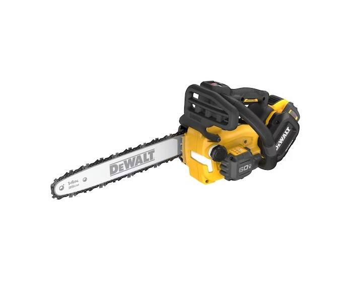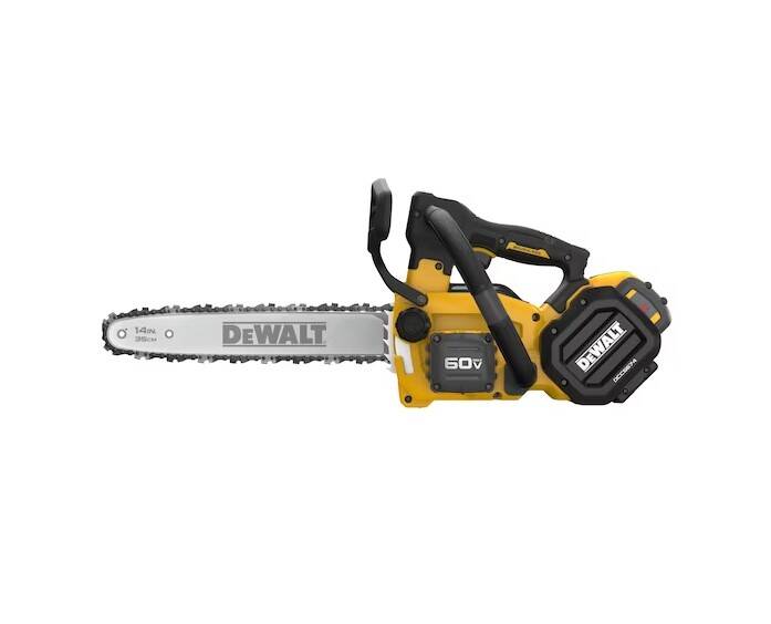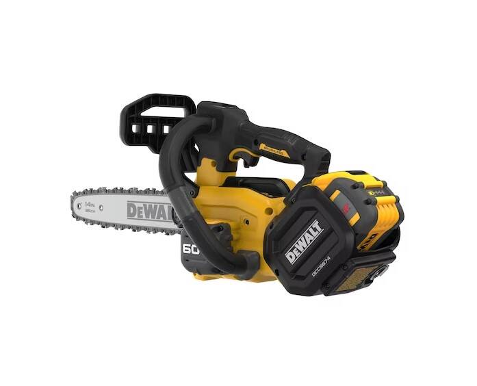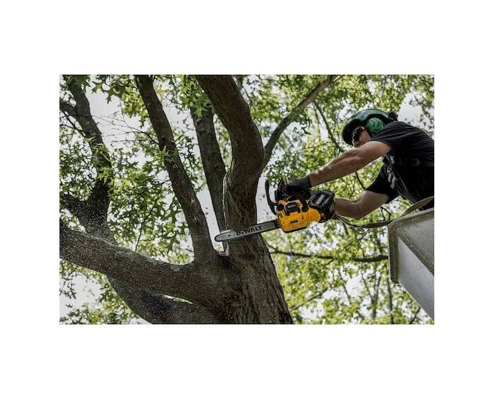 Built for the experienced tree professional, the 60V MAX* 14 in. Top Handle Chainsaw uses advanced FLEXVOLT® batteries to maximize power without the hassles of gas. Cut through an 11 in. log up to 35% faster than a 35cc gas chainsaw with up to 2.4 HP and a chain speed of 23 m/s. Engineered to deliver optimal maneuverability while operating in difficult areas, this saw is ideal for tree pruning and removal. Powered by FLEXVOLT® batteries, this saw has the capacity to make 160 cuts per charge on 4x4 pressure-treated pine†. Equipped with an adjustable oiler, D-ring harness attachment point, tooled tensioning, inertia chain brake, metal bucking spikes, and an LED dashboard, this 60V MAX* 14 in. Top Handle Chainsaw is designed to charge through demanding jobs.