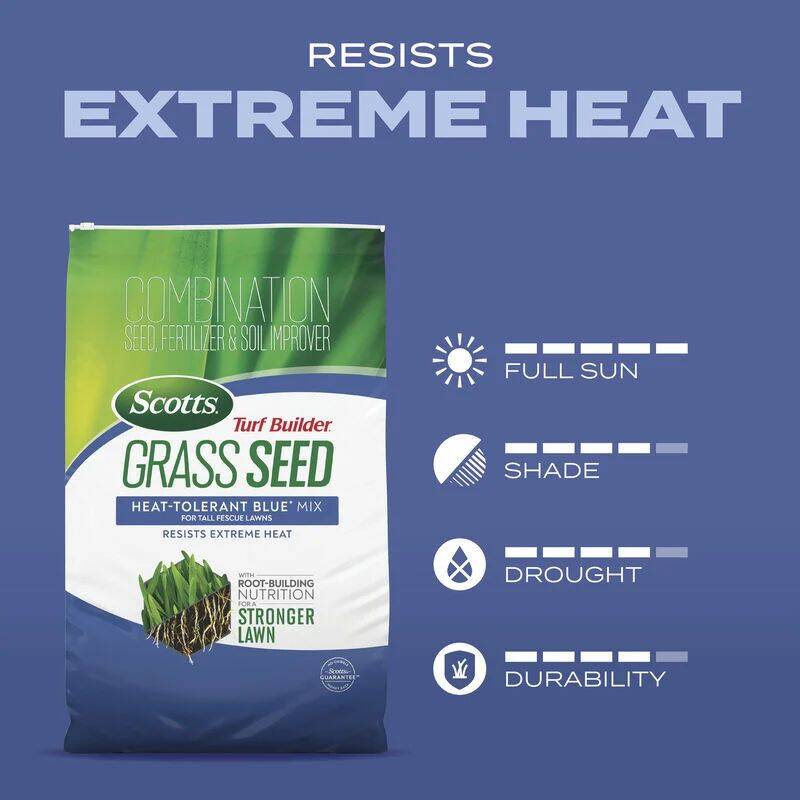 - The redesigned Scotts® Turf Builder® Grass Seed Heat-Tolerant Blue® Mix for Tall Fescue Lawns resists extreme heat and features Root-Building Nutrition for a stronger lawn