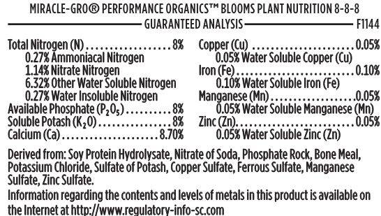| Coverage Area | Each 1 lb. package covers up to 265 sq. ft. when used with Miracle-Gro Performance Organics Garden Feeder. When Miracle-Gro Performance Organics Blooms Plant Nutrition is mixed with 1 Gal of water, you'll have coverage of up to 10 sq. ft. |