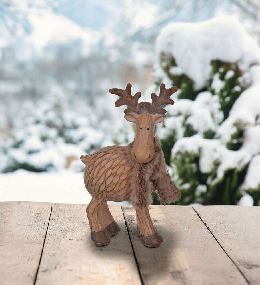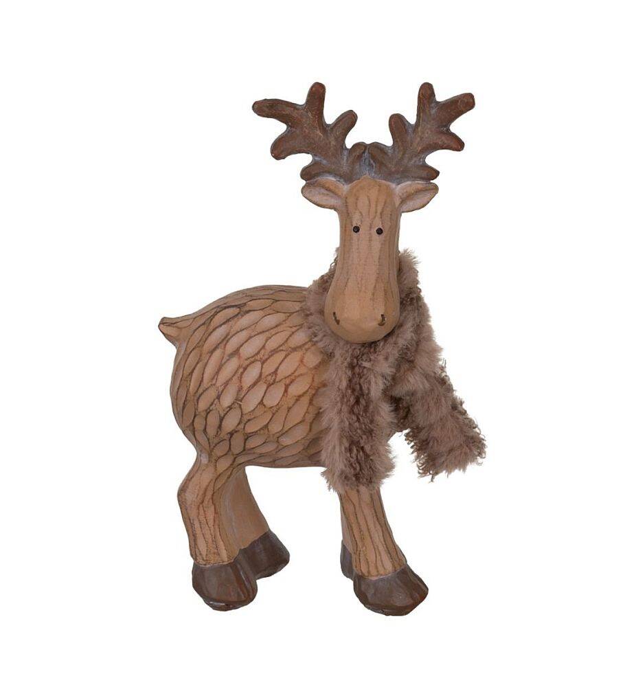Adorable whimsical Moose figurine made of resin with the look and feel of carved wood. Cute expression and wearing a furry scarf.