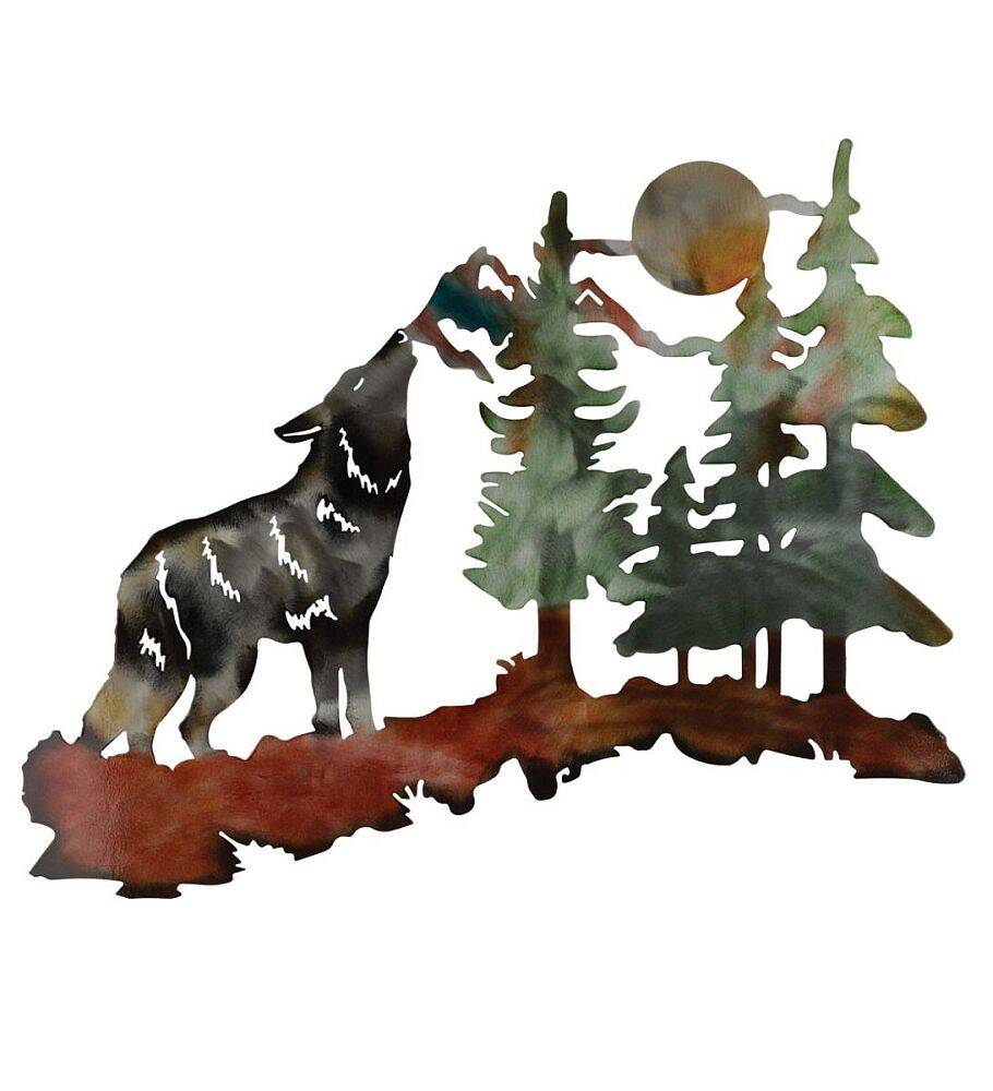 This imaginative Wolf howling in the Woods scene is made from thick metal in translucent colors with a gloss finish. Two sturdy hangers on the back make this a great wall decor for the house or cabin.