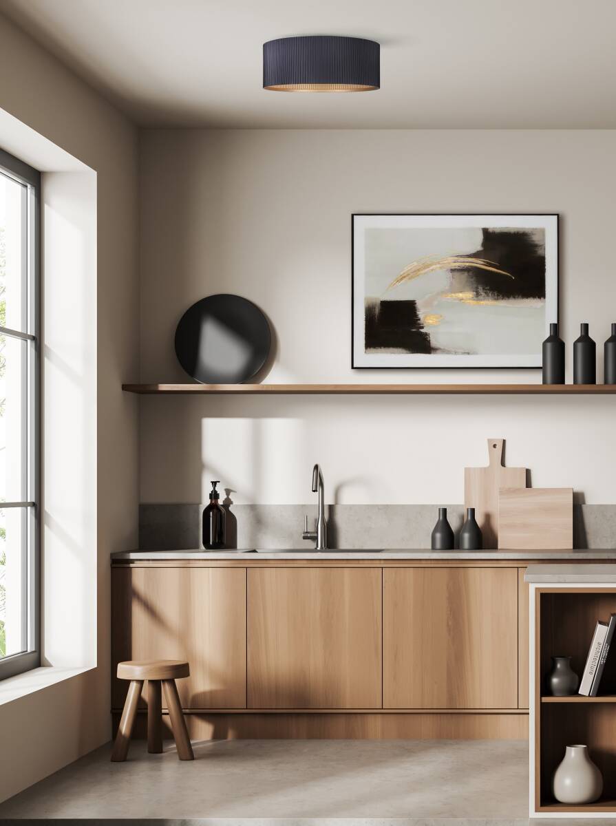 Add an industrial-inspired edge in your hallway or utility with REXTON. REXTON's corrugated metal shade comes in a sleek, modern matte black exterior finish with an interior painted in the perfect shade of gold. It sits flush with the ceiling, and its two lights bounce off the painted gold leaving you with task lighting and ambiance.