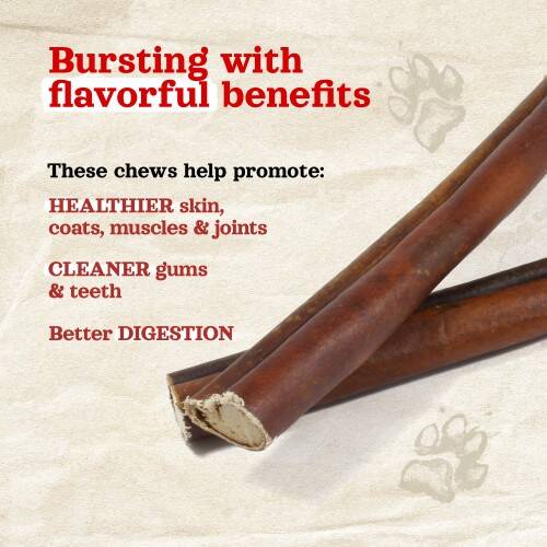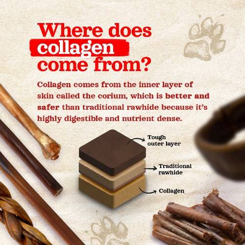 All the enriching benefits of collagen sticks & bursting with peanut butter flavor that dogs will go nuts for—Peanut Butter Stuffed Collagen Sticks offer dogs a mentally stimulating dual texture and a wholesome, long-lasting chew. These highly digestible chews are made from free-range, grass-fed beef skin that’s free of chemicals, hormones, and antibiotics, making them better and safer than traditional rawhide. The decadent peanut butter filling is made with limited ingredients and offers dogs endless decadent, guilt-free enjoyment. They’re also loaded with collagen and protein, promoting healthier skin and joints. Ideal for medium chewers.