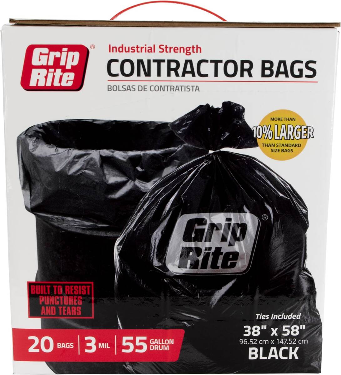 Grip-Rite® 55 gallon industrial strength contractor bags are the top choice for the biggest post-project clean up. Rugged 3 Mil plastic resists punctures and tears from industrial construction debris. With 55 gallons of holding power, Grip-Rite 55 gallon contractor bags are ideal for contractor/industrial clean up, constructions sites, landscaping, demolition projects, and more. Just grab the box by the handle and take it with you to the next project! Get the job done right with Grip-Rite.
