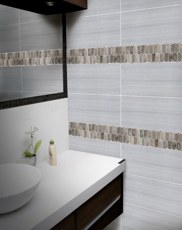 Savoy Picket Pattern Tile is a glass mosaic that features warm browns and greiges in a modern and dynamic picket pattern. This beautiful glass mosaic backsplash tile features varying tones and textures that reflect light throughout a space. Use these tiles to create artistically inspired accent walls, backsplashes, countertops, and other features.