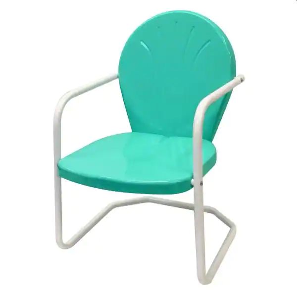 Let's get retro with this metal tulip style metal chair from yesteryear. This chair features a beautiful teal back and seat with bright white contrast piping for the arms and base. With an Art Deco design, these chairs send straight back to the simpler times of the summers in the 1950s.