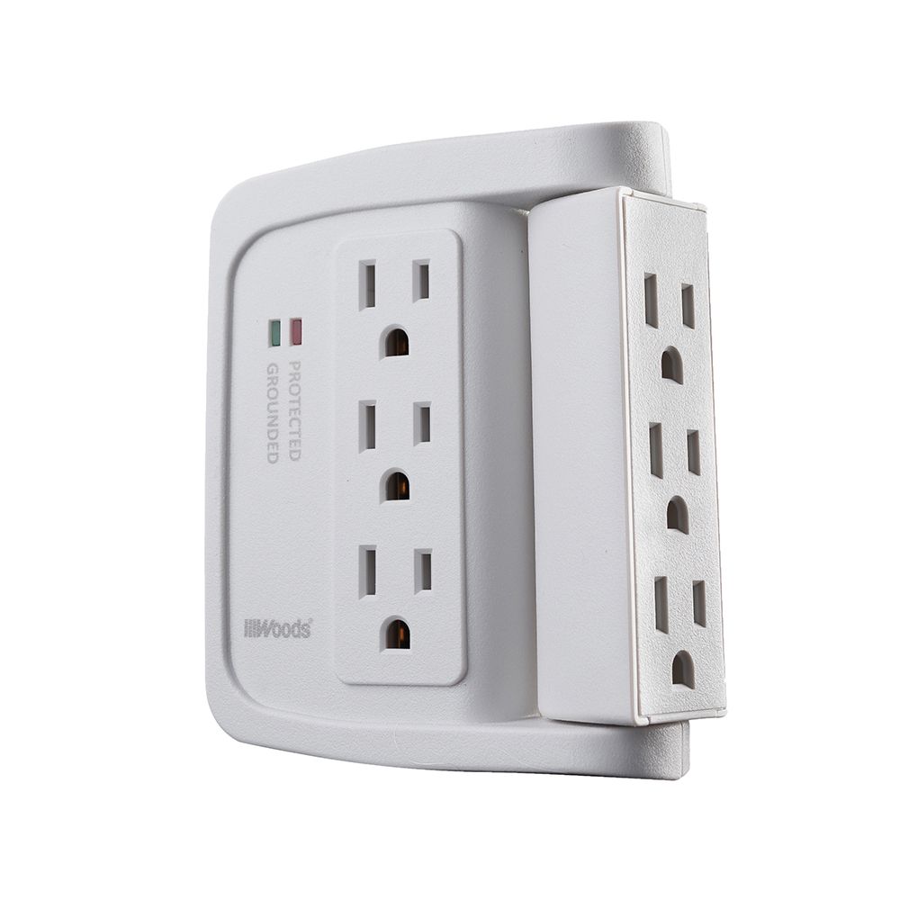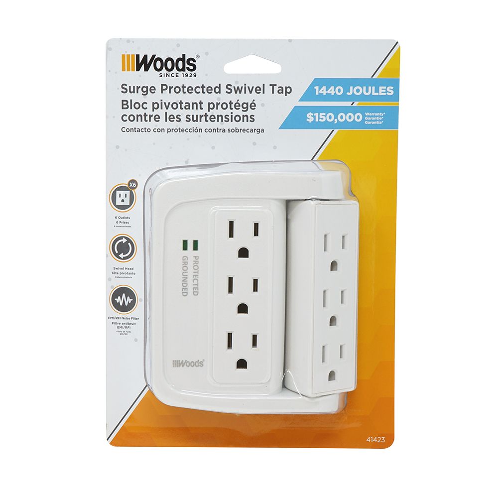 The Woods® 6-outlet swivel surge tap is ideal for saving space and keeping your cords organized and tangle free in your home or office. Featuring 3 outlets that rotate 90-degree and 1440 Joules of surge protection.