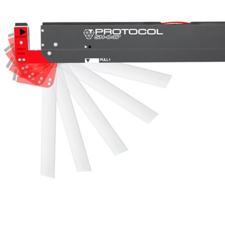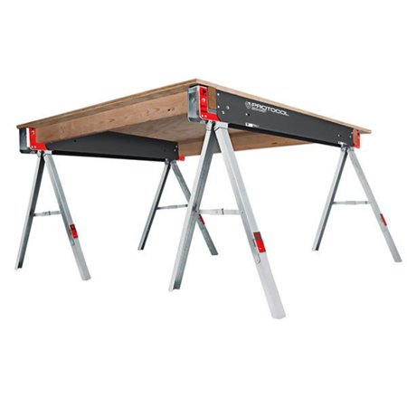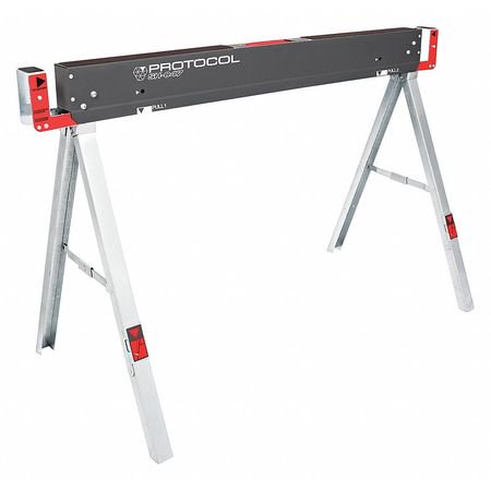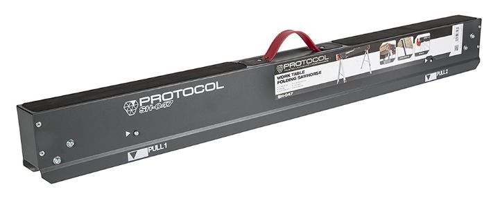 Youre not confined to a 4x4 cubicle and your office certainly isnt standard. Youre a true workhorse, whether at the jobsite or in the garage. Thats where the PROTOCOL SH-047 Folding Sawhorse comes into play. Constructed of high-grade, corrosion-resistant steel, these sawhorses are rated to support 1,100lbs each. Innovative material support pegs allow for sturdy support while cutting, and 2x4 support arms allow you to create a jobsite table or workbench. The zinc-plated, galvanized legs fold away for easy storage, and the built-in handle makes transport a breeze. This sawhorse measures 47-inches wide x 30-inches high.