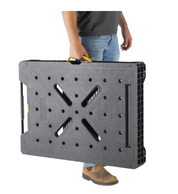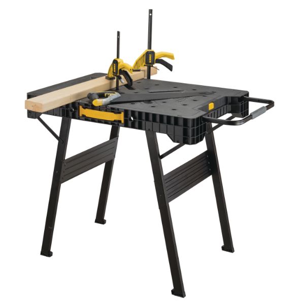 The Express Folding Workbench allows you to create a workspace anywhere in under 3 seconds. It is compact and easy to maneuver around a jobsite or garage and nicely folds for compact storage. The large work surface with holes throughout allow for easy clamping during difficult projects. Its metal legs support 1,000 lbs of weight, great for those heavy-duty projects.