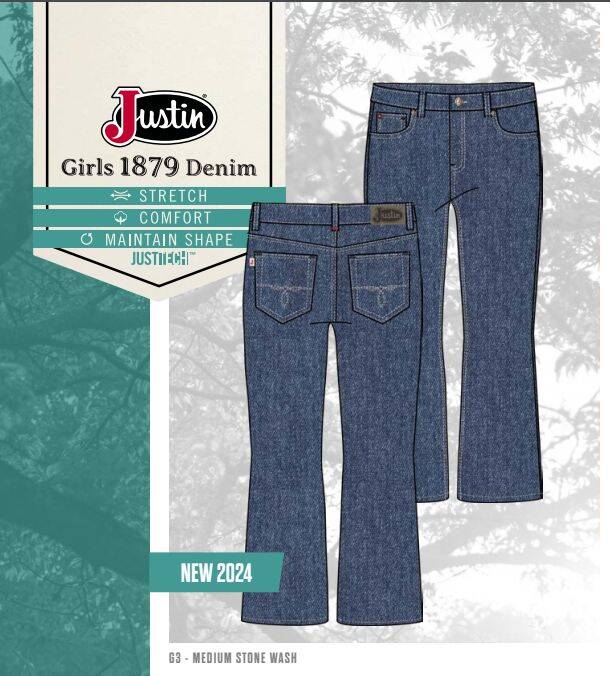 Justin Girls 1879 Denim features stretch and comfort material that maintains shape. These G3 jeans are a midrise bootcut pant and come in a Medium Stone Wash color.