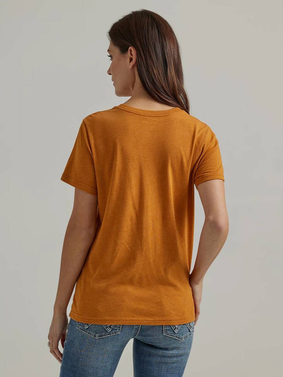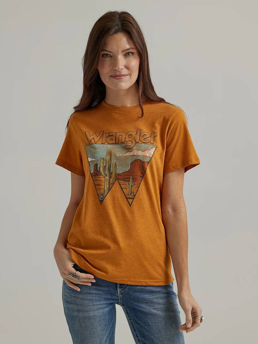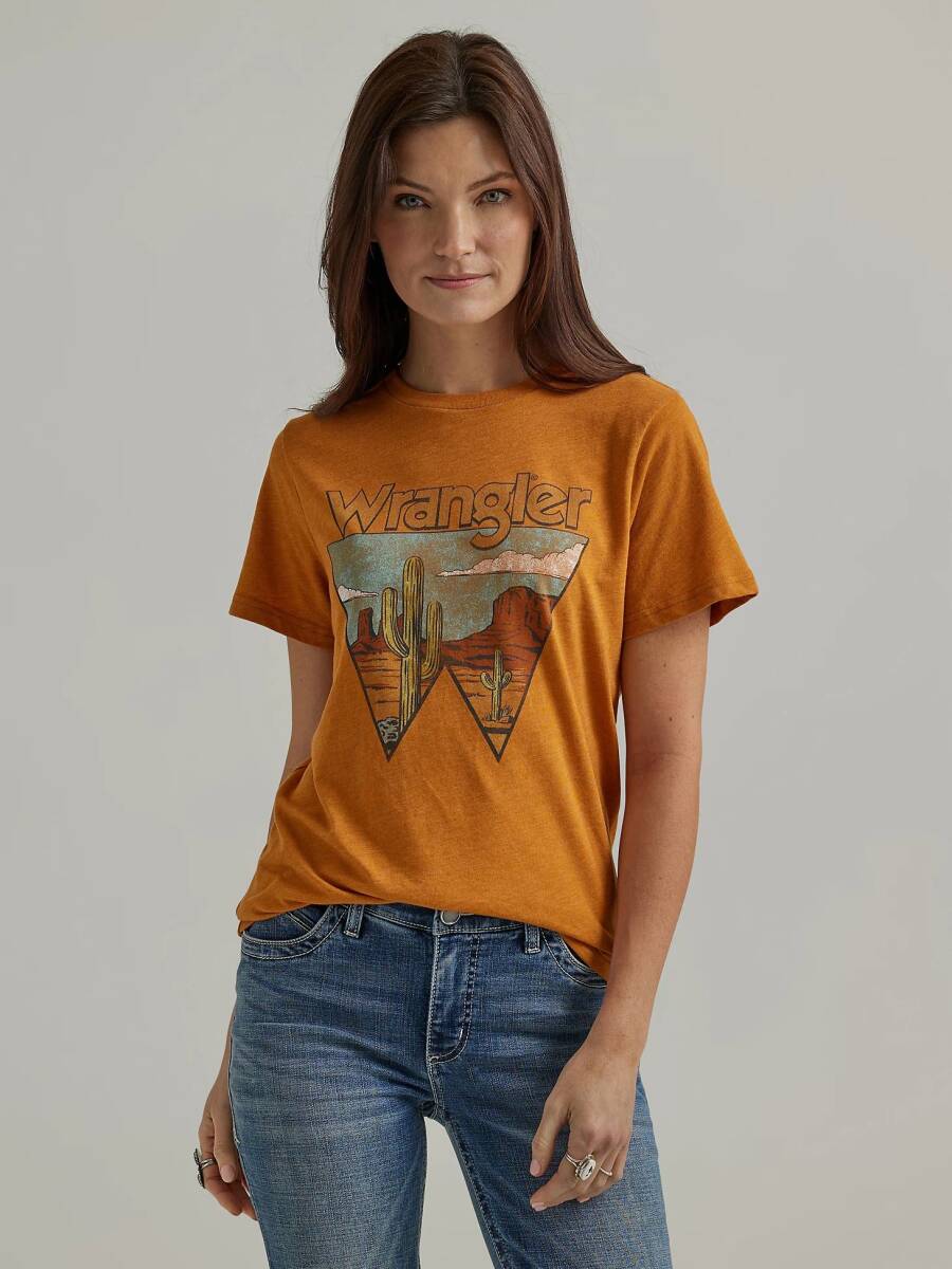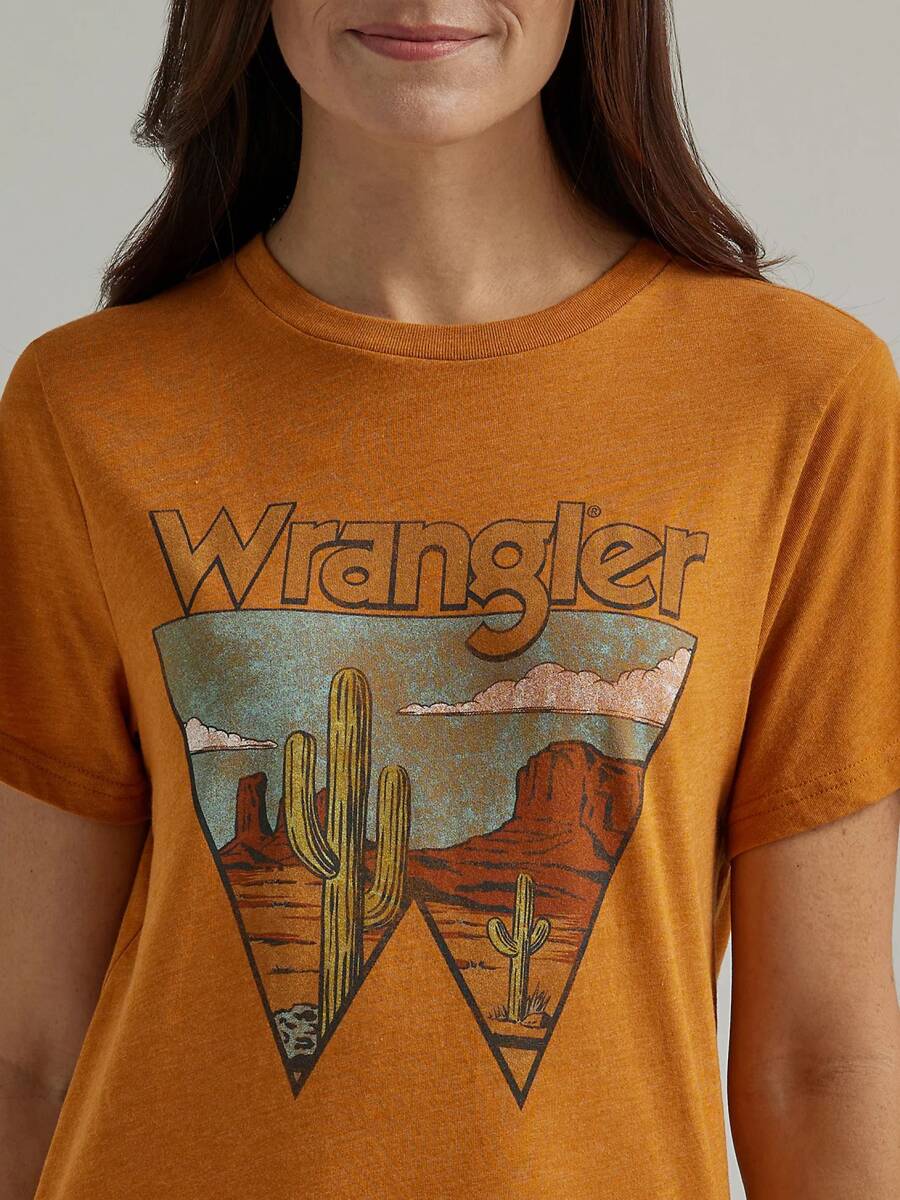 Not only is it comfy and soft, but our Women’s Wrangler Retro® Southwestern Graphic Tee goes with everything. It’s crafted from a lightweight cotton blend you can wear all year long and it features a regular fit that’s not too tight or too loose. Across the chest, it comes with a retro-inspired graphic of the desert landscape and the logo cowgirls have trusted since 1947.