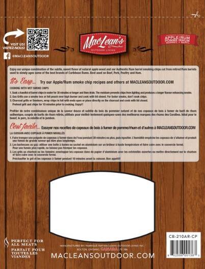 MacLean's Authentic Apple/Rum Barrel Blend BBQ Smoking Chips are cut from retired Rum Barrels used to slowly age many of the best brands of Caribbean Rum then blended with 100% natural Apple Wood to give your meals a sweet and subtle fruit taste with a hit of Rum flavor.