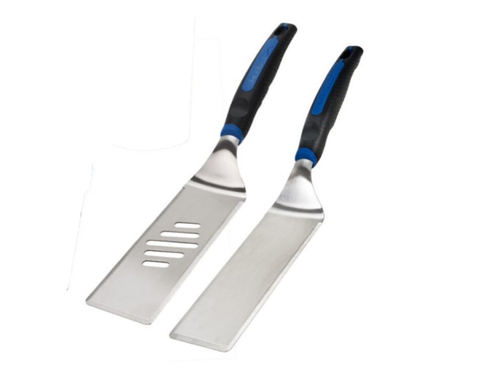 The Razor stainless-steel spatula set is perfect for your outdoor grilling needs. Set comes with one solid surface spatula that can support smaller or loose foods with ease. Set also includes one slotted spatula with beveled edges to slide easily under food and release unwanted grease.