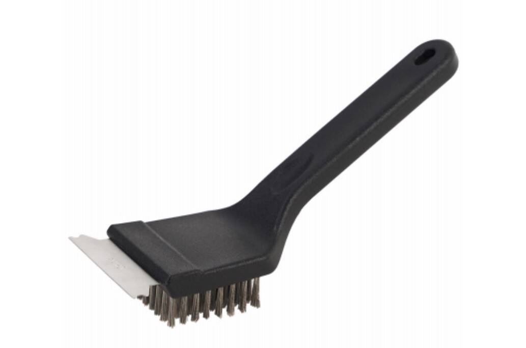 8-inch plastic brush with stainless steel bristles and scraper.