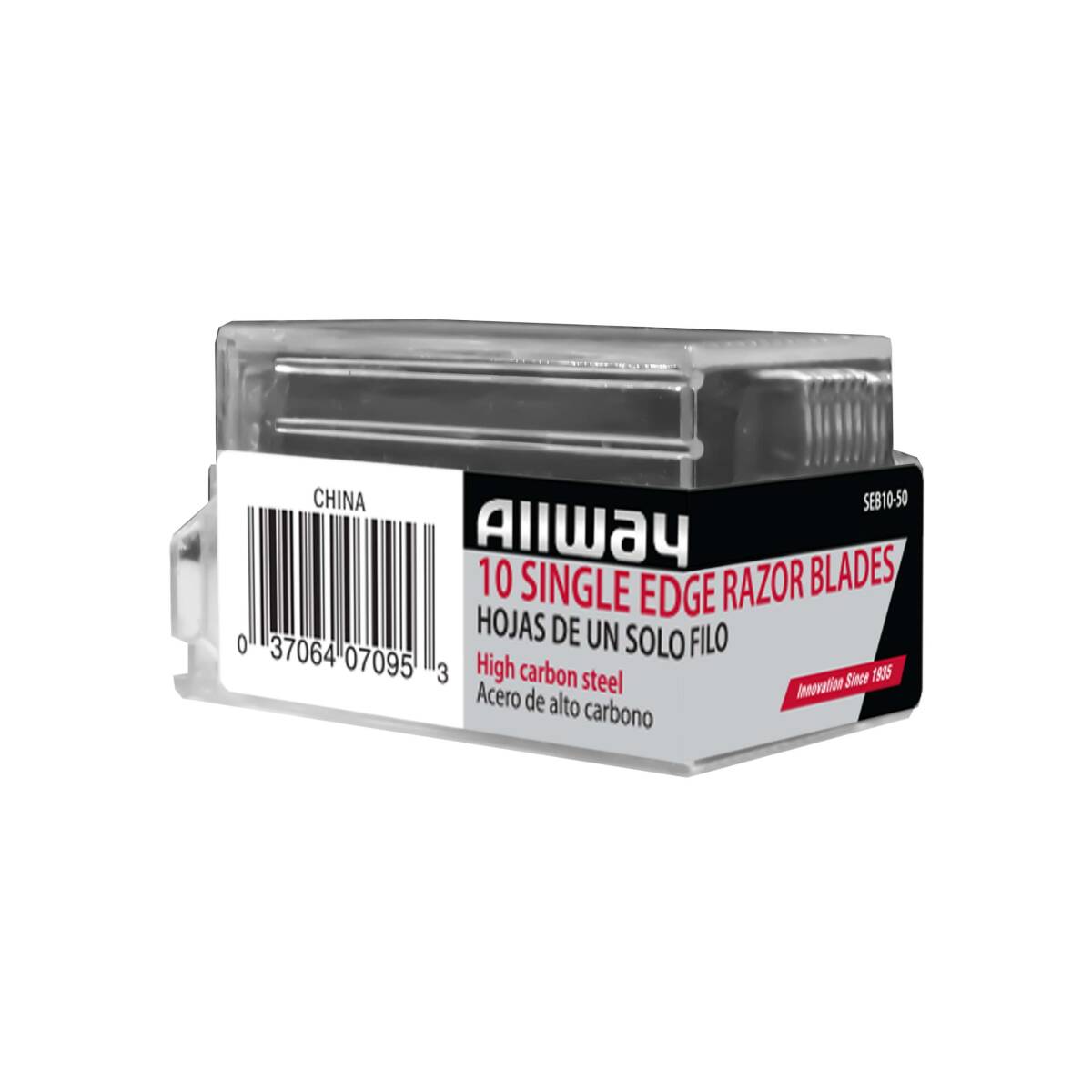 The ALLWAY® Single-Edge Razor Blades come in a high-visibility clear plastic bucket, making them easy to locate and store. Designed to fit most standard single edge scrapers, box cutters, and similar tools, these blades effortlessly tackle label removal, adhesive cleaning, package opening, and more without scratching surfaces. Crafted from durable 1095C high carbon steel, these 0.009? thick blades are built for tough scraping and cutting jobs, featuring a plated steel backing for added resilience. With a patented dispenser that securely holds the blades in place, you won’t have to worry about them falling out in your toolbox. Simply slide out the next blade when needed, making these industrial-quality blades a versatile choice for home, workshop, or office use.