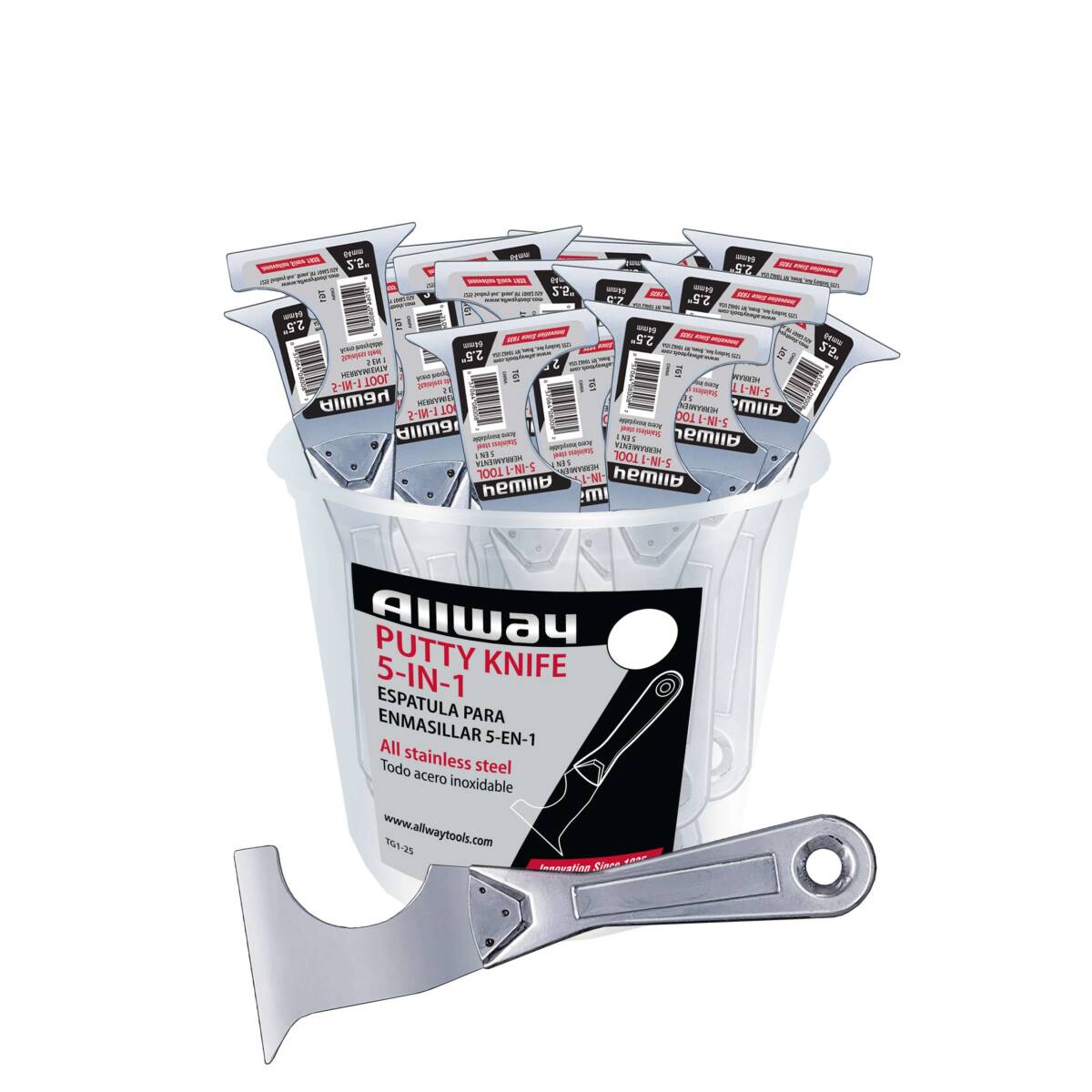 The ALLWAY® 5-in-1 Stainless-Steel Painter’s Multi-Tools come packaged conveniently in high-visibility clear plastic buckets for easy location and storage. These tools stand out as premium additions to any toolbox, offering the performance of five distinct tools in one, saving both time and space. Featuring versatile 2-½” stainless steel blades, they serve as paint scrapers and spreaders/smoothers, while their sharp points efficiently open cracks for patch jobs and their flat ends effortlessly open paint can lids. Additionally, the half round cutouts effectively clean paint from paint rollers. Designed for convenience, these tools are easy to clean and powder coated for enhanced rust resistance, ensuring durability and reliability for all your painting needs.