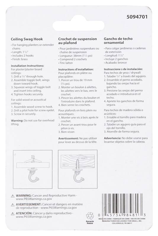 2-3/16 - Inch White Zinc Ceiling Mount Hook