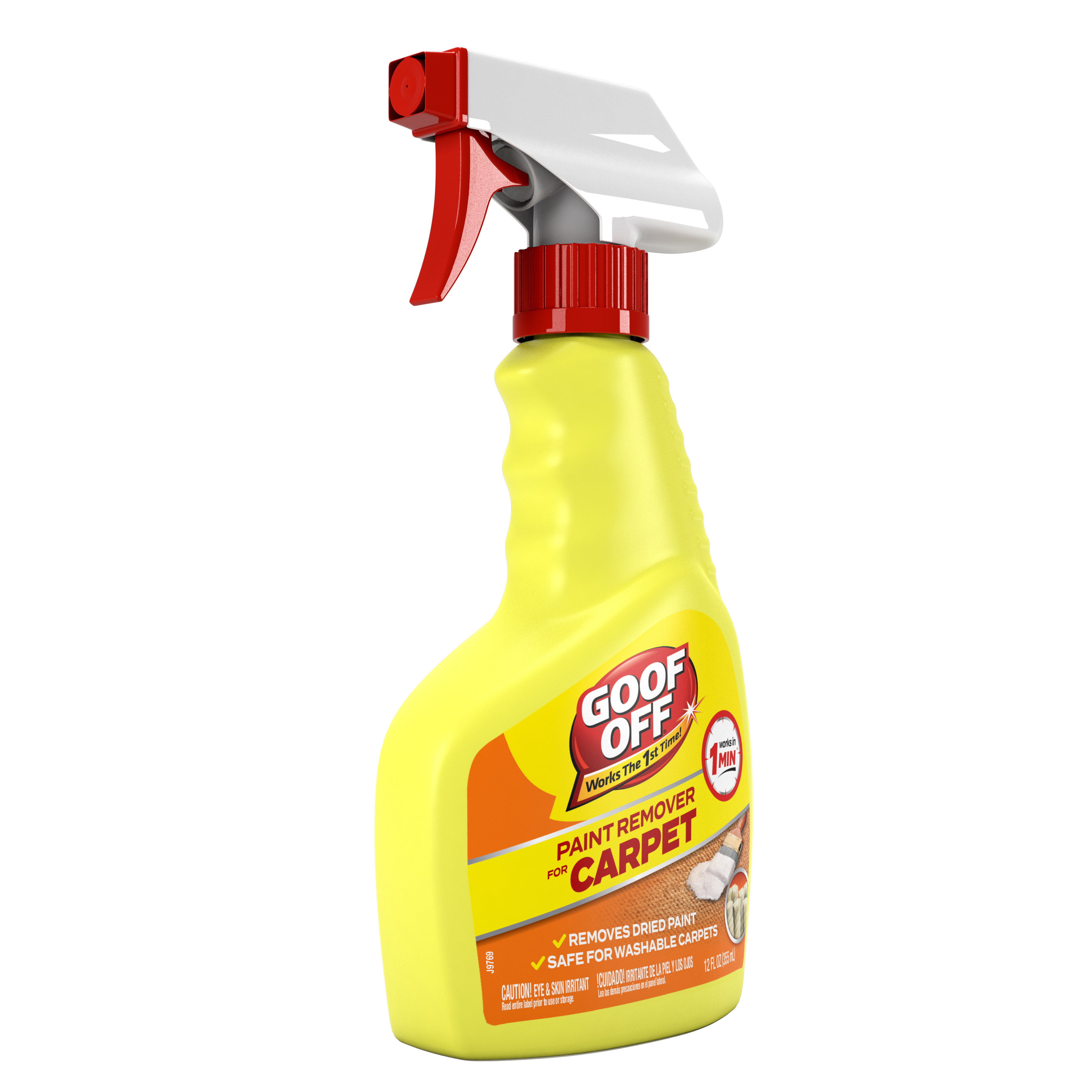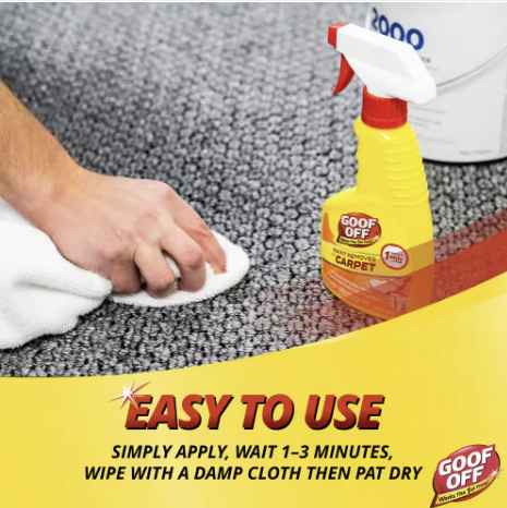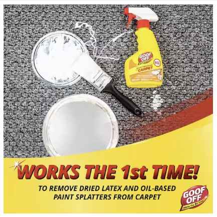 Goof Off Paint Remover for Carpet is the trusted carpet cleaner product by professional tradesmen and Do-It-Yourself consumers to remove the toughest dried paint from the soft surfaces of carpet and rugs. Treat it, don’t trash it! This carpet stain remover works fast to remove costly messes dried latex or oil-based paints leave behind. No need to get a new rug, simply spray the Goof Off Paint Remover for Carpets and wipe the dried paint away in only a minute. This paint splatter solution is safe to use on all washable carpets and rugs. Keep out of read of children. Read and follow all label directions.