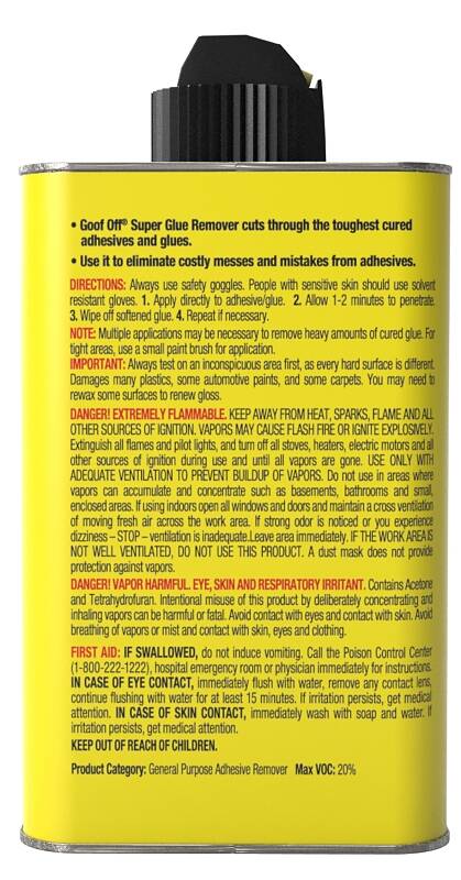 Goof Off Super Glue Remover works the first time to remove the toughest cured adhesives and dried glues. This remover, trusted by crafters and Do-It- Yourselfers, helps avoid costly messes and mistakes from adhesives. It clears away the toughest glues like Super Glue, epoxy adhesive and Gorilla Glue. To use, directly apply to dried glue or adhesive then wipe with a cloth. Watch as this super adhesive glue remover works to remove the dried glue that had once left you puzzled. If you are looking for an adhesive remover, look no further. The Goof Off Super Glue Remover gets the job done. Keep away from children. Read and follow all label directions.