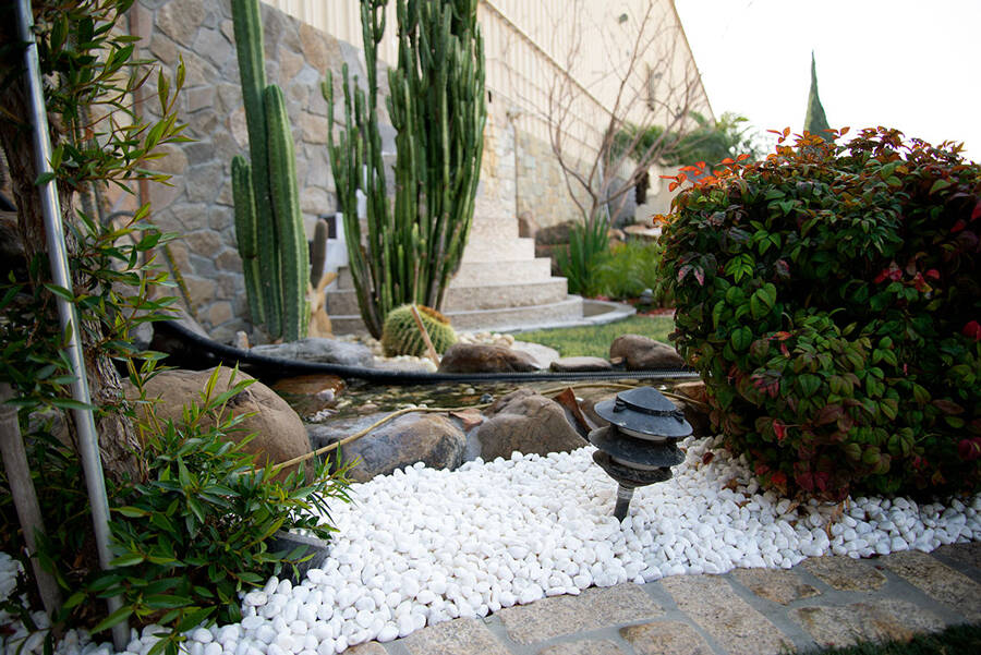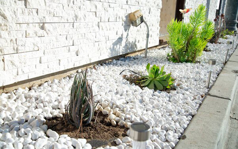 Elegant Himalaya White Pebbles feature white and beige tones and all the character of natural beach pebbles. These fine polished or tumbled marble garden rocks suit a variety of landscaping projects. Use to create wandering paths, keep weeds at bay around trees, or accent landscape features, including fountains and water features.