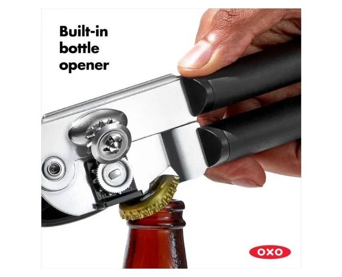 The Soft-Handled Can Opener has big, cushioned handles and an oversized knob that turns easily, taking the hard work out of opening cans. The sharp cutting wheel is made of sturdy stainless steel. Also features a built-in bottle opener.