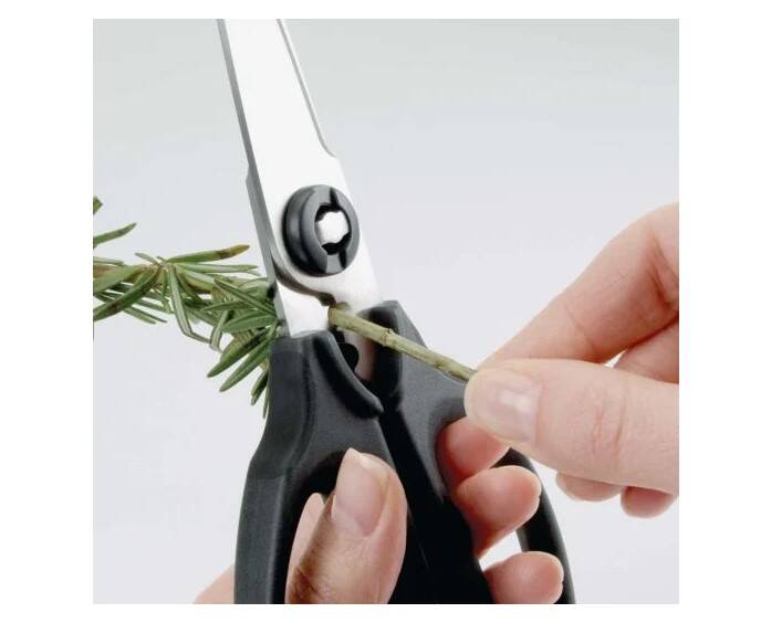 Keep these Kitchen and Herb Scissors handy for cutting meat, veggies, twine and more. The soft handles feature cushioned pads to absorb pressure. The herb stripper above the handles removes fresh herbs from tough stems, and the micro-serrated blades separate for easy cleaning.