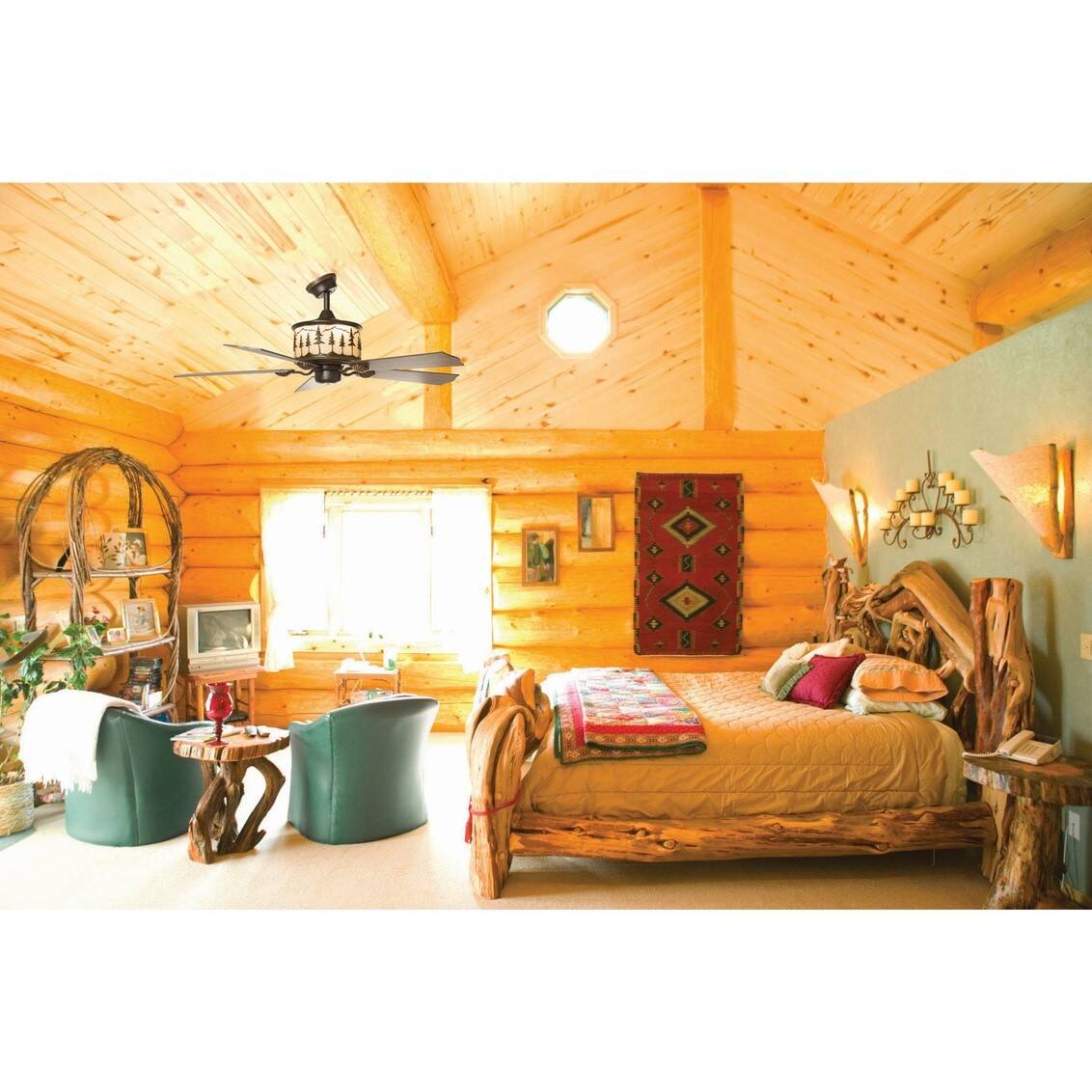Evoking the spirit of the wilderness, this rustic themed ceiling fan is clad in a burnished bronze finish and features silhouetted tree imagery atop glowing amber flake glass. It a great choice for a vacation lodge, cabin or a suburban home - it will complement a variety of home styles: anywhere you want to bring an element of nature. Add a light kit (sold separately) to brighten up your space. This fan is compatible with sloped ceilings and includes a 6 inch down rod (longer down rods sold separately). Remote control included for added convenience. Blades are reversible; choose between rosewood and dark walnut. Unique lighted motor housing with energy saving LED bulbs (included).