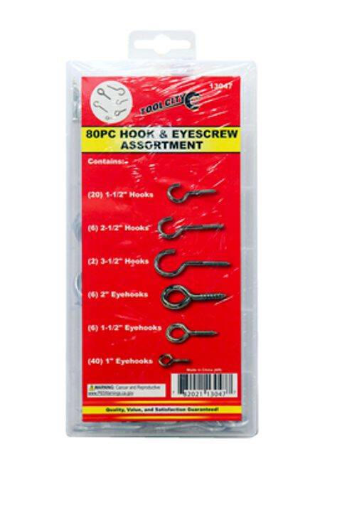Includes (20) 11/2 in hooks, (6) 2 1/2 in hooks, (2) 3 1/2 in hooks, (4) 2 in Eyehooks, (6) 1 1/2 in Eyehooks, (40) 1 in Eyehooks