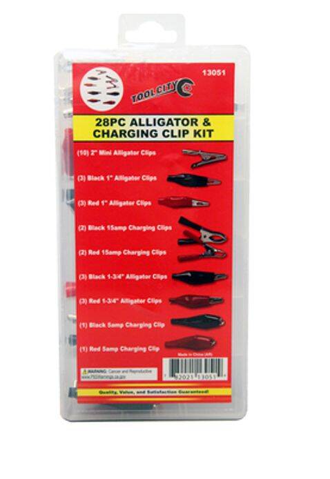 Includes (1) 2 in mini alligator, (3) black 1 in alligator clip, (3) red 1 in alligator clip, (2) black 15-amp charging clip, (2) red 15-amp charging clip, (3) black 1 3/4 in alligator clip, (3) red 1 3/4 in alligator clip, (1) black 5-amp charging clip, (1) red 5-amp charging clip