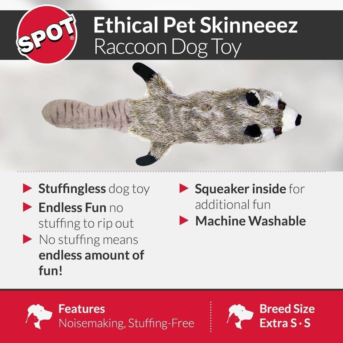 Skinneeez stuffing free dog toy satisfies a dog’s natural hunting instinct. With no stuffing to rip out, they offer long lasting play. The realistic Raccoon design provides a flip flopping action dogs love.