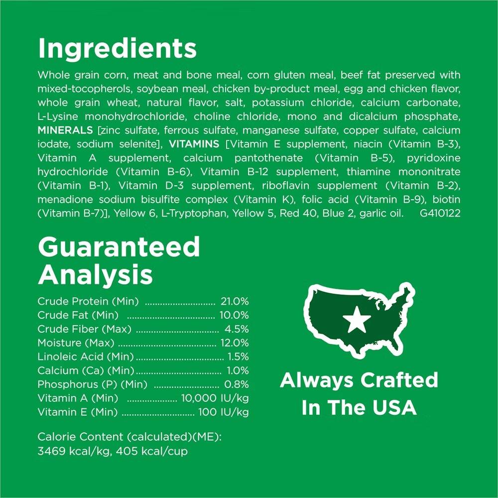 | Ingredients | Whole grain corn, meat and bone meal, corn gluten meal, beef fat preserved with mixed tocopherols, soybean meal, chicken by-product meal, egg and chicken flavor, whole grain wheat, natural flavor, salt, potassium chloride, calcium carbonate, L-Lysine monohydrochloride, choline chloride, mono and dicalcium phosphate, MINERALS [zinc sulfate, ferrous sulfate, manganese sulfate, copper sulfate, calcium iodate, sodium selenite], VITAMINS [Vitamin E supplement, niacin (Vitamin B-3), Vitamin A supplement, calcium pantothenate (Vitamin B-5), pyridoxine hydrochloride (Vitamin B-6), Vitamin B-12 supplement, thiamine mononitrate (Vitamin B-1), Vitamin D-3 supplement, riboflavin supplement (Vitamin B-2), menadione sodium bisulfite complex (Vitamin K), folic acid (Vitamin B-9), biotin (Vitamin B-7)], Yellow 6, L-Tryptophan, Yellow 5, Red 40, Blue 2, garlic oil. |