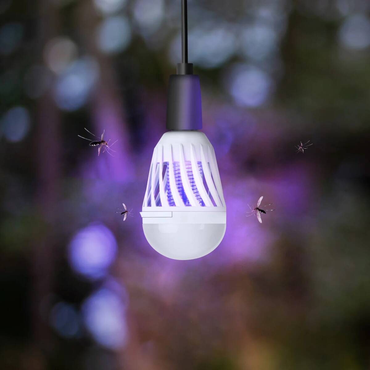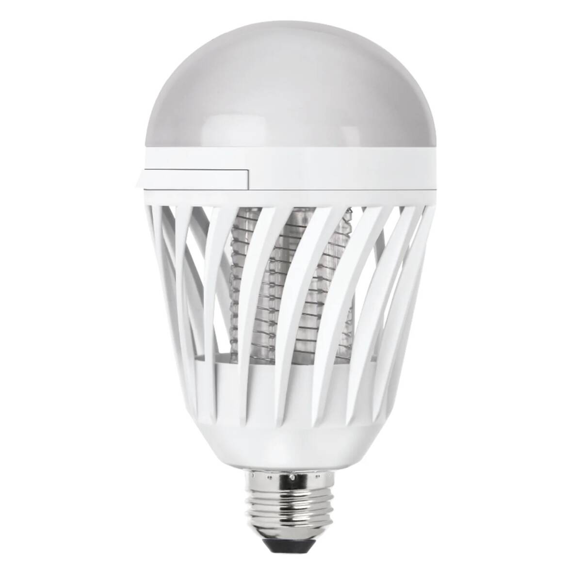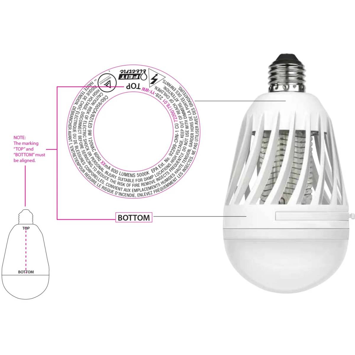 Zap away annoying bugs and insects with this advanced Feit Electric dual-purpose bug zapper and LED light bulb. Ideal for indoor or outdoor use, the zapper employs 5000K Daylight White light and blue UV light to attract flying insects and kill them on site. The bug zapper is a chemical-free solution with a protective outer cage for safe installation and a removable tray for hassle-free clean-up. This non-dimmable LED bug light will replace a 60-watt equivalent incandescent bulb using only 9 watts of electricity. With a 3-way switch control, you can change from LED-daylight light to blue UV light for zapper use or use combined light and zapper together. The Feit Electric C60/950CA/BZ/LED bug zapper has an average life of 15,000 hours, is RoHS compliant and is 100% mercury free.