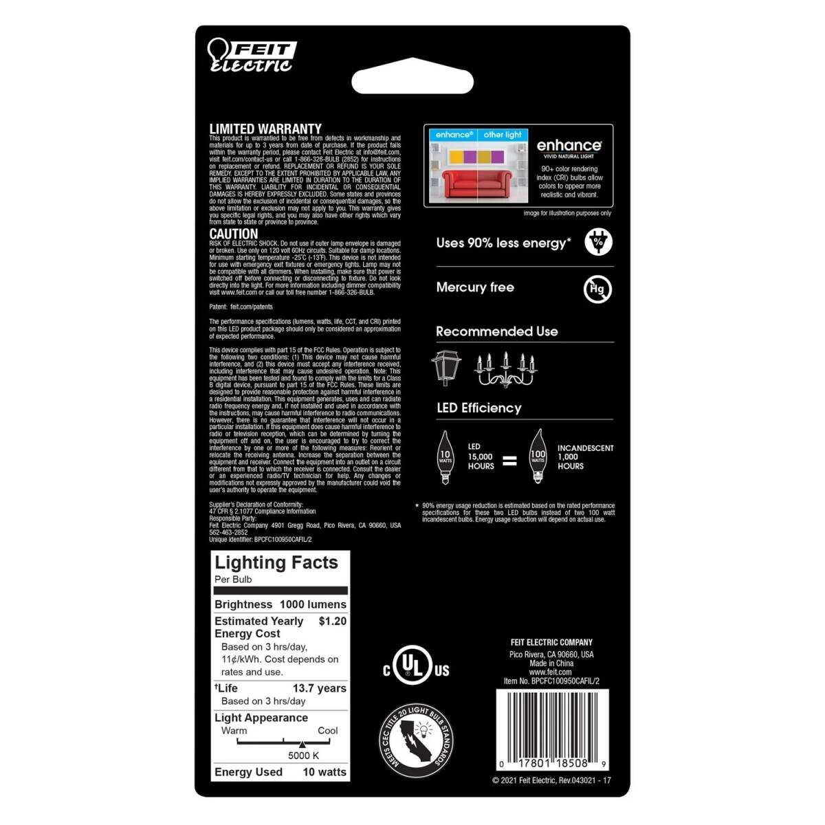 Combine the vintage glass filament lighting look and feel with the advantages of modern LED technology with these stylish light bulbs from Feit Electric. Energy efficient LEDs replace a 100-watt incandescent, producing a 5000K Daylight color temperature light that energizes mornings and illuminates fine details. A stylish bent tip shape with exposed filament wrapped in glass housing is ideal for chandelier fixtures and will enhance the décor of any room. Enhance 90+ CRI light makes colors vibrant and skin tones more natural, all while saving energy and lasting for decades.