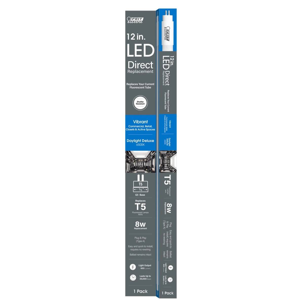 Feit Electric’s 8-watt Equivalent Direct Replacement (Type A) Non-Dimmable Linear LED Tubes replace F8T5 or T5 fluorescent and LED tubes. They work with most existing electronic ballasts for quick and easy plug-and-play installation, with no rewiring necessary. Each Linear LED light produces 450 lumens, while using less energy than fluorescents. These bluish white 6500K Daylight Deluxe White lights allow you to see objects in finer detail and create a vibrant mood for both residential and commercial spaces. Use them in closets to see every wardrobe detail. They are ideal for retail stores, gyms, convenience stores, and hospitals, and high-traffic locations where customers and employees need to feel alert or focused. T512/865/LED lights turn on instantly, offering flicker-free full illumination with no warmup time compared to fluorescent tubes. They are mercury-free, with a shatter-resistant coating for safe and easy disposal. Each high-quality bulb offers accurate color-rendering, for more vibrant, true-to-life colors. Lower heat emission extends the life of the tube and ends do not turn black or burn with age. Switch to Type A LED linear lights for your space and get up to 35,000 hours of superior light. That's 31.9 years based on 3 hours of daily use.