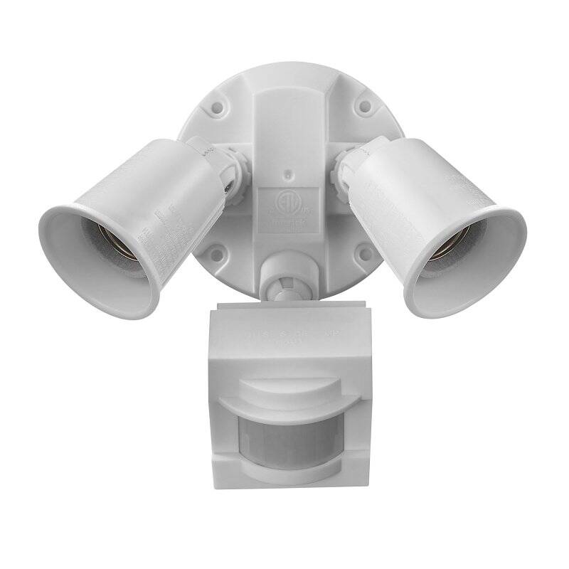 Upgrade your outdoor spaces with the motion sensor swivel arm security flood light. Experience motion detection capabilities from all angles with a remarkable range of up to 60 ft or 18 m and a 110 deg detection zone. Automatically turning off after 1, 5 or 10 min gives you the flexibility to choose the duration that suits your needs. The rotating arm design allows easy adjustment of the motion sensor so you can place the light on either your wall or eave. Likewise, the swivel arms allow desired light placement for any space. Use 2X standard base E26 PAR38 shape 120 W max bulbs - compatible with incandescent and LED. Includes all mounting hardware to give you the option to wall-mount or eave-mount and enjoy its weather-resistant, durable resin construction. Ideal for pathways, sheds, garages and more. Backed by a 2 year warranty, you can trust in the GLOBE ELECTRIC commitment to quality.