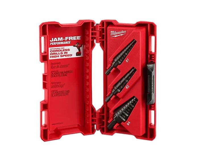 Includes (1) #4 Step Drill Bit 3/16 in - 7/8 x 1/16 in, (1) #2 Step Drill Bit 3/16 in - 1/2 in x 1/16 in, (1) #1 Step Drill Bit 1/8 in - 1/2 in x 1/32 in, (1) Carrying Case