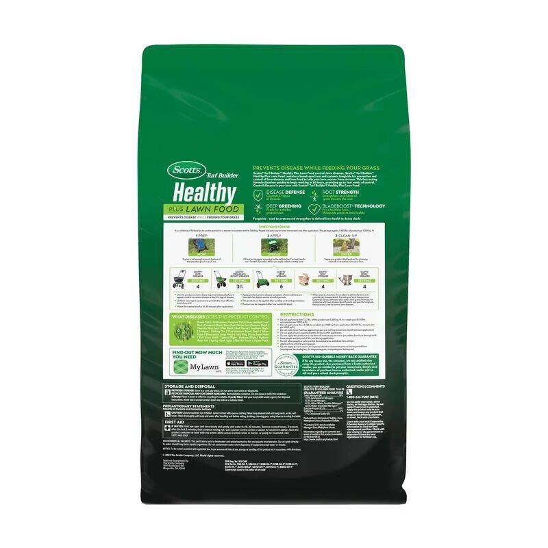 Scotts® Turf Builder® Healthy Plus Lawn Food is a 2-in-1 lawn care product that contains a broad-spectrum and systemic fungicide for prevention and control 27 types of lawn diseases, including brown patch, leafspot, powdery mildew, and red thread. In addition, the added fertilizer feeds for a thicker, greener lawn and strengthens each blade of grass down to the root to help your lawn recover from stresses. This fast-acting formula dissolves quickly to begin working in 24 hours, providing up to four weeks of control. Scotts® Turf Builder® Healthy Plus Lawn Food is for use on all grass types (when used as directed). Apply prior to disease symptoms when conditions are favorable for disease and/or stressful periods. We recommend using a Scotts® spreader to apply this product (please refer to spreader settings on product label). Water the treated area for 15-20 minutes after application. One 13.70 lb. bag of Scotts® Turf Builder® Healthy Plus Lawn Food covers 4,000 sq. ft.