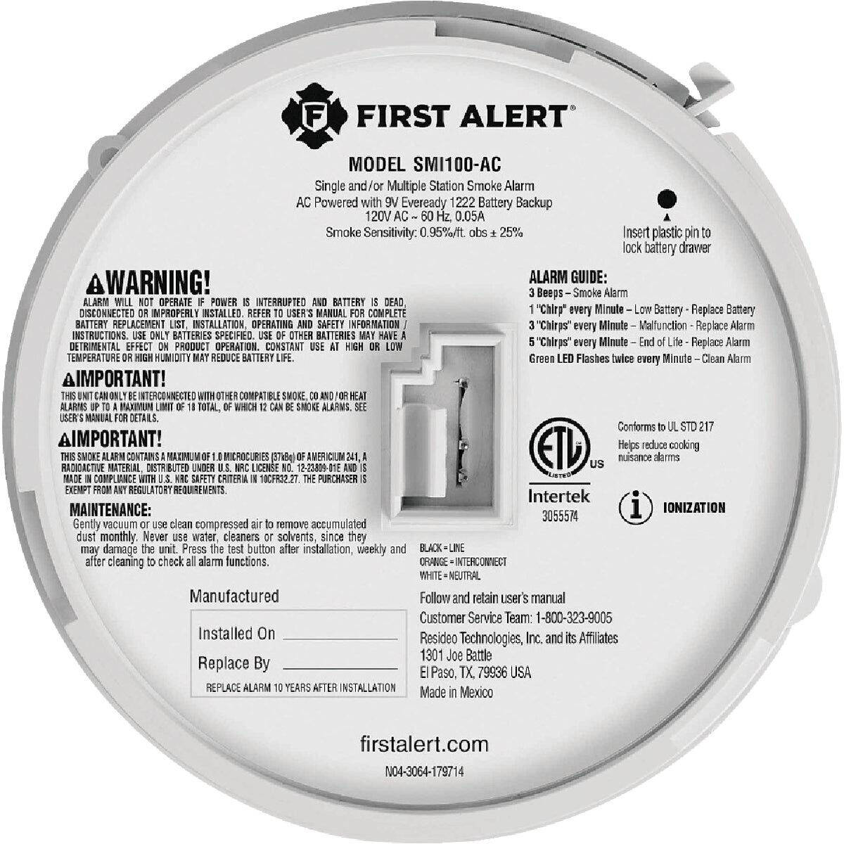 AC/DC Ionization Sensor 10-Year Interconnect Hardwire White Smoke Alarm