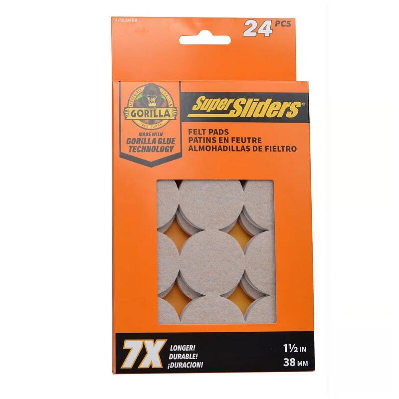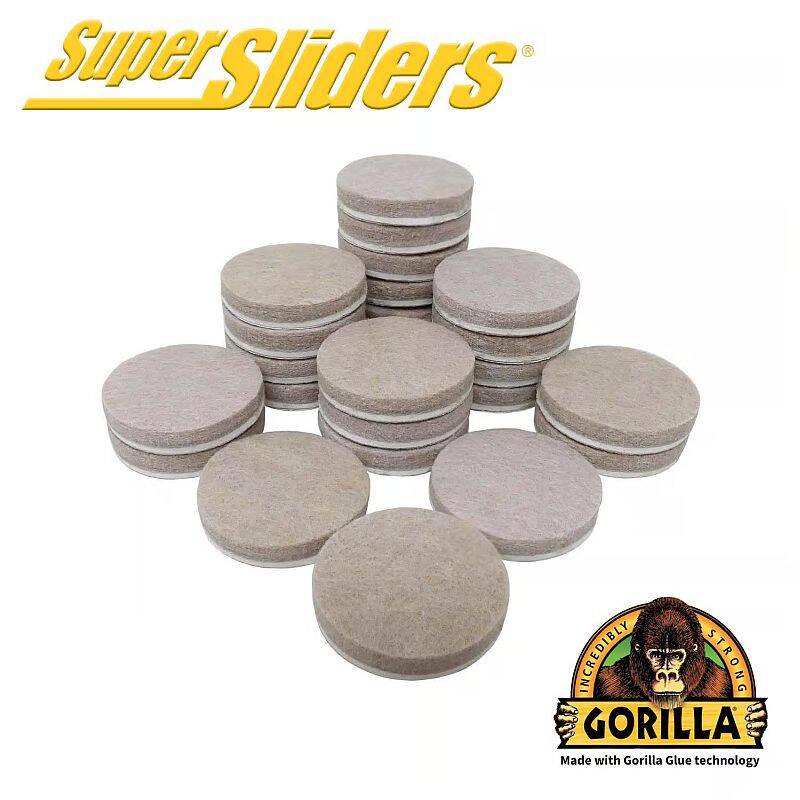 Super Sliders Gorilla Felt Pad featuring Gorilla Glue Adhesive. Gorilla Glue has the highest brand recognition in adhesives. Super Sliders felt pads and bumpers have the highest bond strength. Protects hardwood, tile, vinyl and laminate surfaces from marring and scratches. Moves furniture quietly and easily without much friction and noise.