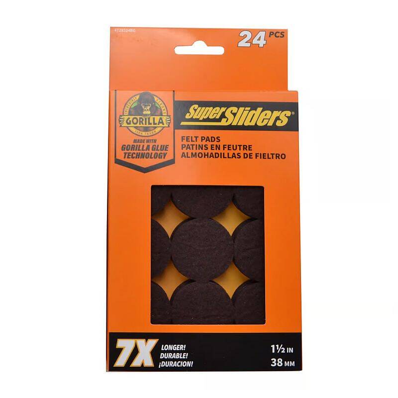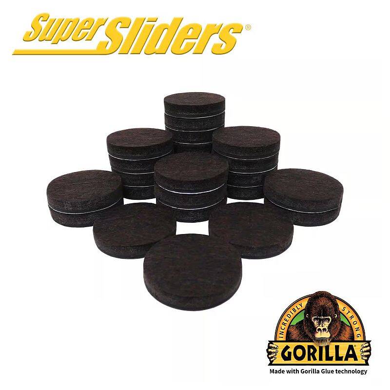Super Sliders Gorilla Felt Pad featuring Gorilla Glue Adhesive. Gorilla Glue has the highest brand recognition in adhesives. Super Sliders felt pads and bumpers have the highest bond strength. Protects hardwood, tile, vinyl and laminate surfaces from marring and scratches. Moves furniture quietly and easily without much friction and noise.