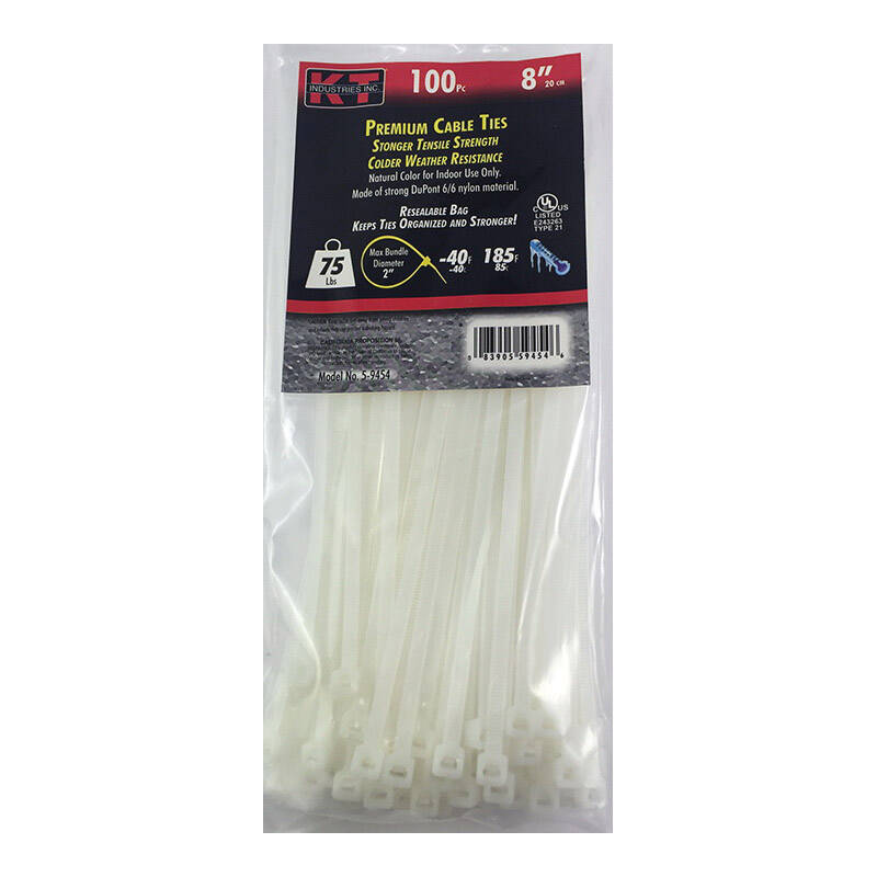 KT cable ties are made from strong DuPont 6/6 nylon material. This material yields a higher break points even at colder temperatures then the competition. Packaged in resealable bags to help preserve moisture and keeps ties organized. Higher moisture gives most zip ties more tensile strength.