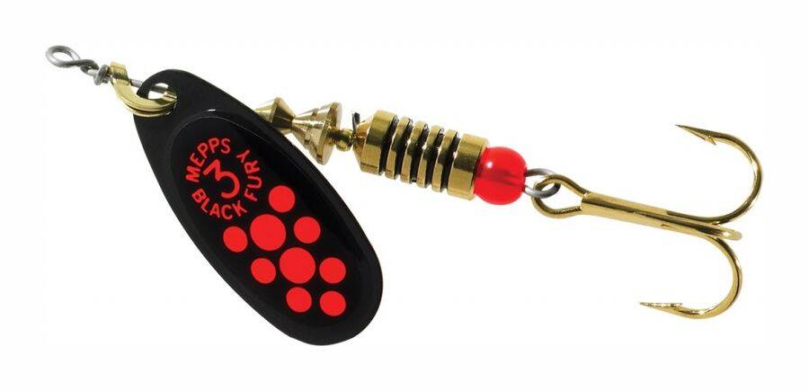 The Black Fury with a plain treble hook is one of the great all-time Mepps spinners. The special Black Fury blade spins closer to the body than the classic Aglia blade so it easily fishes shallow to mid-depths. All Mepps Black Furys are excellent low light (early morning, evening or overcast) spinners as well as a perfect choice for sunny days when contrast with the brightness of the water, weeds and structure is needed. Whether you select a plain or dress Black Fury is strictly personal preference. Most panfish and bass fishermen prefer dressed spinners, while most trout and salmon fishermen prefer plain treble hook Black Furys. Either is very effective at catching a wide variety of freshwater game fish. Largemouth bass, smallmouth bass and walleye fishermen should also consider a Black Fury Combo.