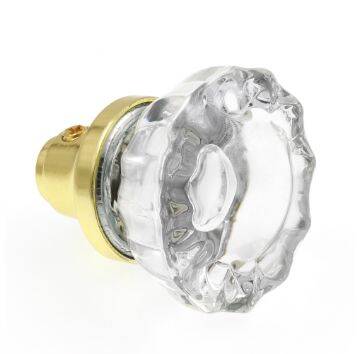 This vintage style glass door knob set is constructed of clear fluted glass and brass plated materials. This knob set is designed for indoor use only, and it fits door panels from 1 inch to 1-3/4 inch thick.