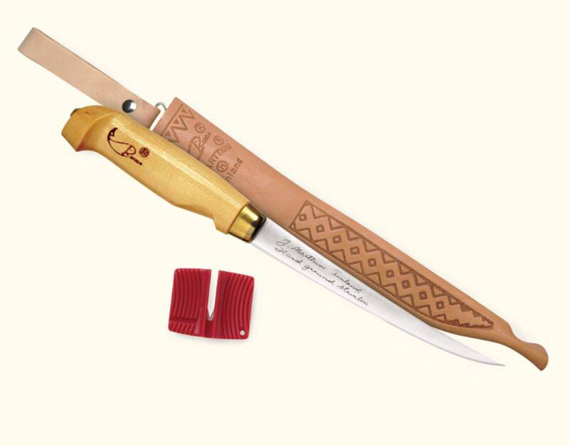 Made by Marttiini, the makers of premium Rapala fillet knives for over 50 years.More guts than any other knife, this is the one that taught the world to fillet. A favorite since the early days of NormarkĀ® with over 100 million sold to date, this knife is used in more fishing camps, on more charter boats and by more fisherman than any other fillet knife in the world. Progressively tapered, flexible, full-tang blade of European stainless steel that takes and holds an ultra-sharp edge is securely anchored in legendary birch handle. All protected by a fine tooled leather Laplander sheath with 'safety-first' free-swing belt loop that always keeps sheath and blade clear of the body. With four blade sizes to choose from, there's one just right for every fish cleaning chore. Includes easy-to-use single-stage sharpener that keeps blade razor sharp.