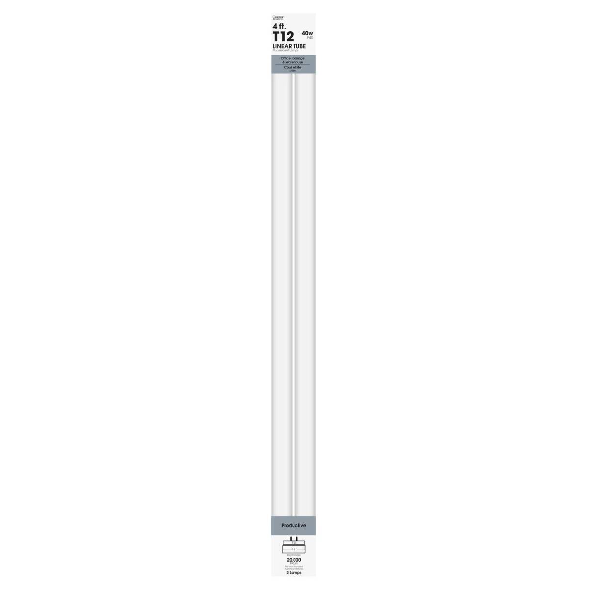 Feit Electric’s?40-watt Cool White Non-Dimmable Fluorescent Linear Tubes replace?T12 fluorescent tubes.?These 2600-lumen lights in 4100K Cool White provide clean, mid-range light for both living and workspaces. Use them for multi-purpose lighting or task lighting. An ideal choice for?offices, garages, workspaces, warehouses, and more. Replace older, lumen depreciated light bulbs with newer fluorescent light bulbs to maintain full brightness. F40CWX/2?lights have an estimated energy cost of only $4.82 per year. Switch to Feit Electric linear lights for your space and get up to 20,000 hours of superior light. That's 18.3 years with 3 hours of daily use.