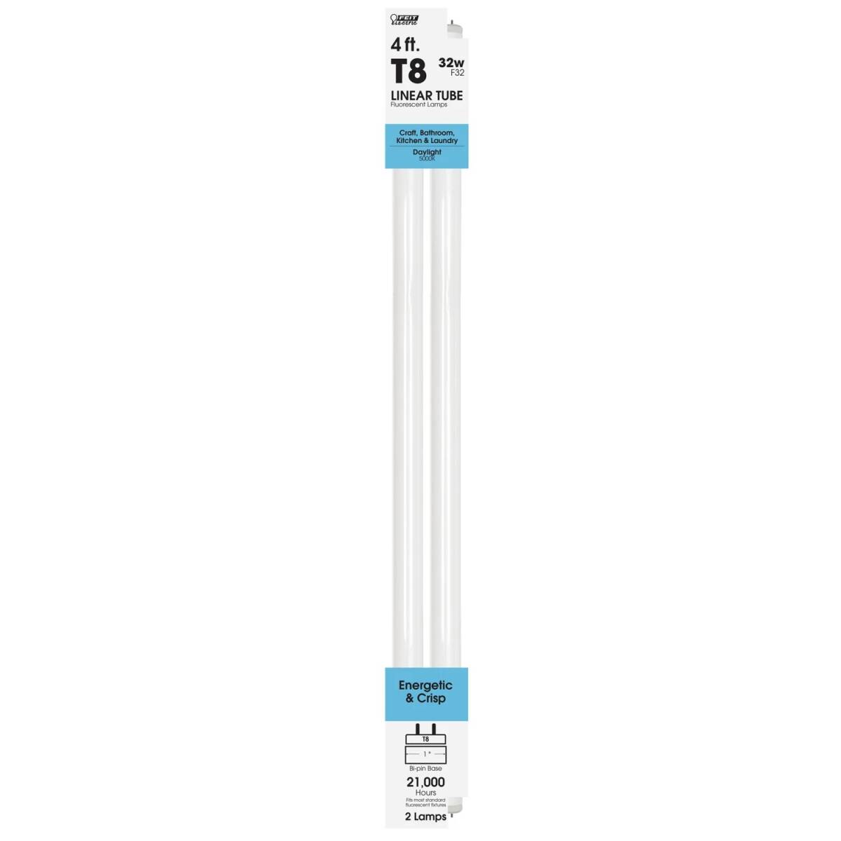 Feit Electric’s 32-watt Non-Dimmable Linear Fluorescent Tubes replace F32T8 or T8 tubes. Each light produces 2600 lumens of 5000K Daylight White light?for both residential and commercial spaces. Use them in craft rooms, bathrooms, kitchens, laundry rooms, utility rooms, outdoor security lighting, classrooms, and hospitality settings. Replace older, lumen depreciated light bulbs with newer fluorescent light bulbs to maintain full brightness. F32T8/950/2?lights have an estimated energy cost of only $3.85 per year. Switch to Feit Electric linear tube lights for your space and get up to 21,000 hours of superior light. That's 19.2 years based on 3 hours of daily use.