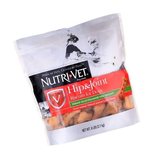 Nutri-Vet Hip & Joint Biscuits provide standardized levels of glucosamine for dogs in a crunchy wafer to help maintain healthy canine joint function and connective tissue. This peanut-butter flavored treat is veterinarian formulated to provide the best joint supplement for dogs.