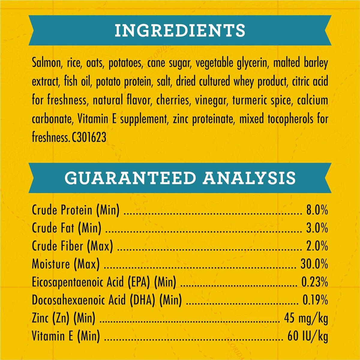Ingredients Salmon, rice, oats, potatoes, cane sugar, vegetable glycerin, malted barley extract, fish oil, potato protein, salt, dried cultured whey product, citric acid for freshness, natural flavor, cherries, vinegar, turmeric spice, calcium carbonate, Vitamin E supplement, zinc proteinate, mixed tocopherols for freshness. C301623