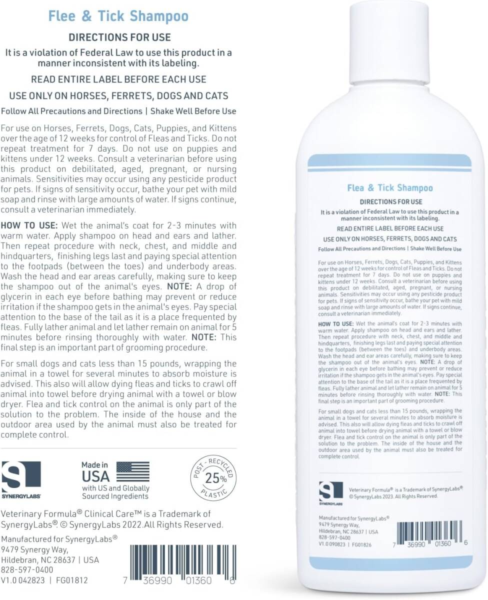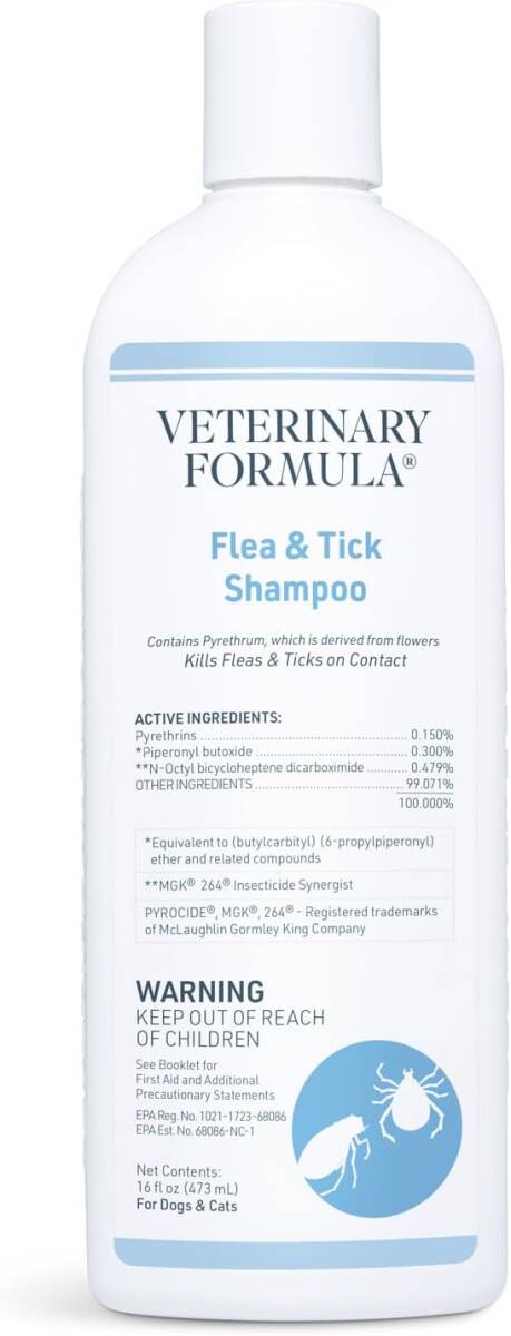 Veterinary Formula Flea and Tick Shampoo contains up to 3x more active ingredients than competitive brands. It’s cat and dog shampoo that is formulated with pyrethrum, a natural insecticide, to kill and control fleas and ticks on contact, soothe irritations from flea and tick bites, while also gently cleansing and exfoliating your pet’s skin and coat.
